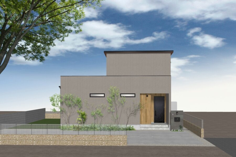 住宅地にたたずむ美術館かカフェのようなお家。玄関を入ると広い土間が現れ、導かれるようにリビングへ進むと、グレーを基調に効き色のブラックが点在するスタイリッシュな空間が広がる。夜のライトアップで外観の雰囲気はがらり。フォルムの美しさが一層引き立つ。